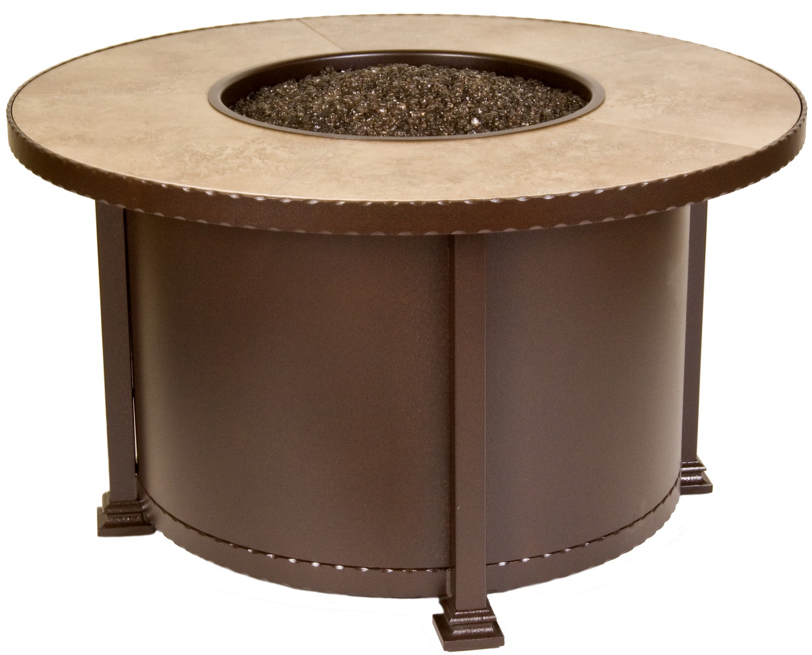 The Santorini Fire Pit quick-ship initiative includes a choice of three hearth tops. The 42-inch hearth tops feature hand-cut ceramic tiles in Sand, Mocha or Calico. The Santorini Fire Pit has a rich Espresso finish and comes with burner assembly. Fire ring inserts can be ordered such as a Log Kit with lava rock granules, Ceramic Rock Kit with lava rock granules, Glass Kit with decorative glass in two colors, or Lava Granules only.