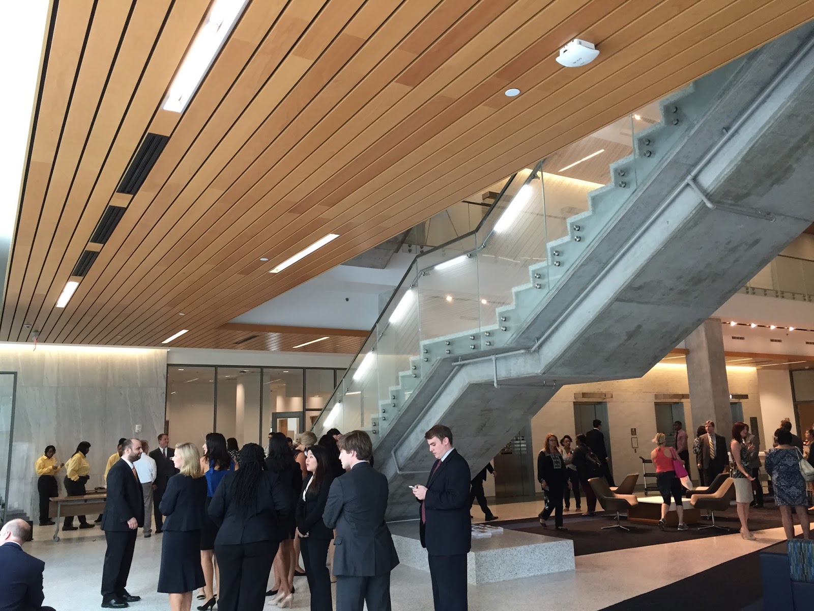 Recently, three members of our Eberly & Collard Public Relations team, Don Eberly, Jeff Collard and Kristen Pappaterra, had the privilege of joining our client as well as state government and judicial leaders, alumni, and others for the building’s ribbon-cutting ceremony. The event and tour yielded us an in-person vantage point to learn about the design solutions provided by Stevens & Wilkinson and other members of the project team, information we will be using to develop and execute an architecture and construction public relations campaign for our client.